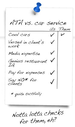 If you sponsor a lecture event, you're undoubtedly familiar with the uneasy rush of fielding last-minute glitches and then having to drop everything, meet the speaker at the airport and get them settled. You could send a volunteer, but that may present some lingering unknowns. A car service would certainly be acceptable, but for around the same cost, we can step in to make a professional first impression, brief them on the event and deliver them on time, outfit your green room, help with the Q & A, and provide technical support and fresh insight on your program. (All this while the limo driver would be eating a sub and doing the crossword.) There's something perfectly fitting and respectful about providing your speaker with an independent assistant/advocate. They won't feel compelled to be "on" at every turn, and you (and their lecture agent) will experience unprecedented levels of peace of mind.